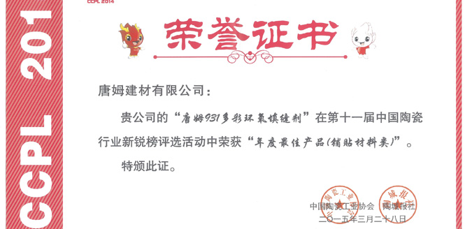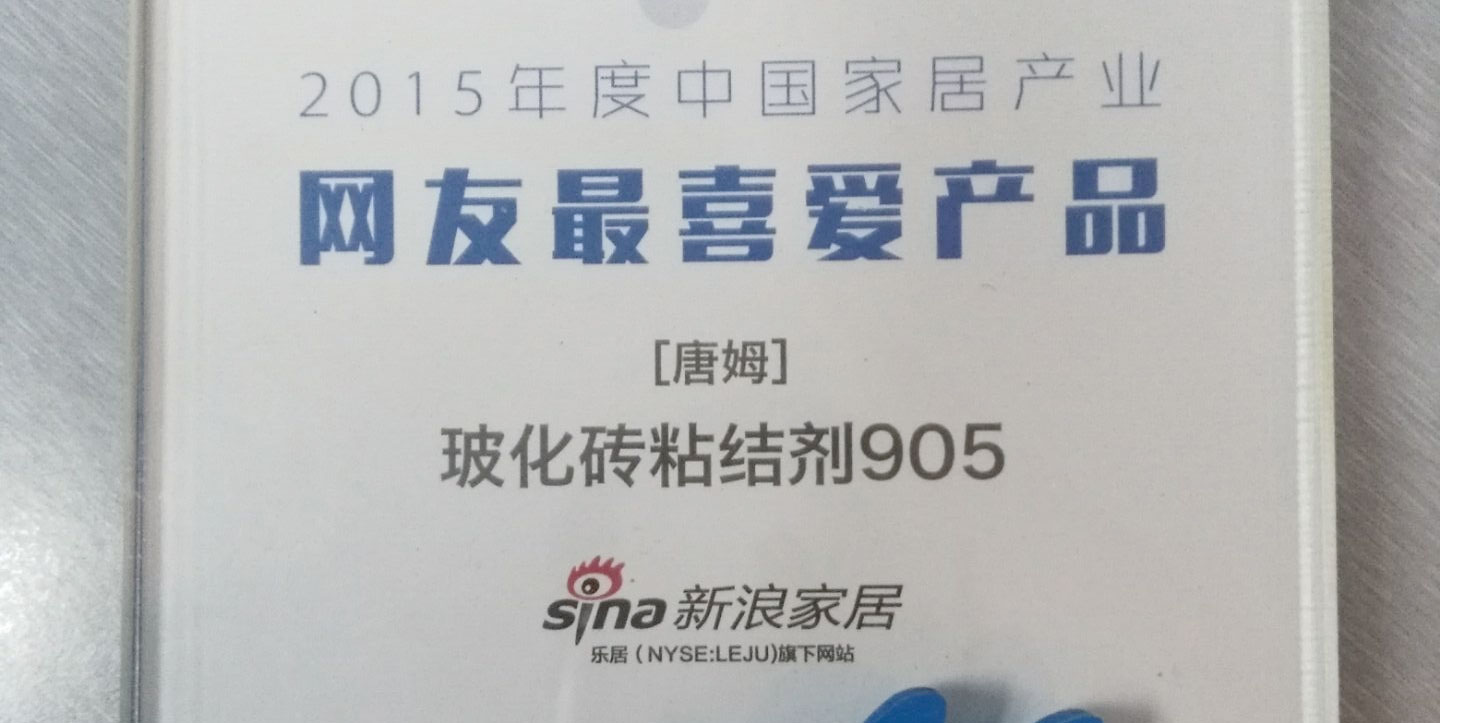 唐姆玻化磚粘結(jié)劑905榮獲“2015年度中國(guó)家居產(chǎn)業(yè)網(wǎng)友最喜愛(ài)產(chǎn)品”