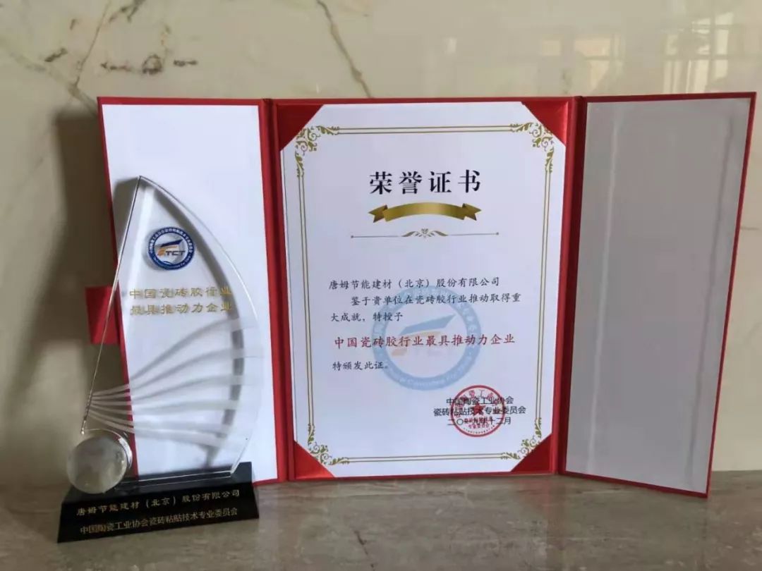 經(jīng)過陶瓷委員會(huì)專家的評(píng)議及行業(yè)的監(jiān)督反饋,唐姆建材(北京)股份有限公司喜獲:中國瓷磚膠行業(yè)發(fā)展突出貢獻(xiàn)獎(jiǎng)(企業(yè))、中國瓷磚膠行業(yè)最具推動(dòng)力企業(yè)、中國瓷磚膠行業(yè)最具影響力品牌?偨(jīng)理趙振林先生:榮獲中國瓷磚膠行業(yè)杰出企業(yè)家、中國瓷磚膠行業(yè)發(fā)展突出貢獻(xiàn)獎(jiǎng)(個(gè)人)
