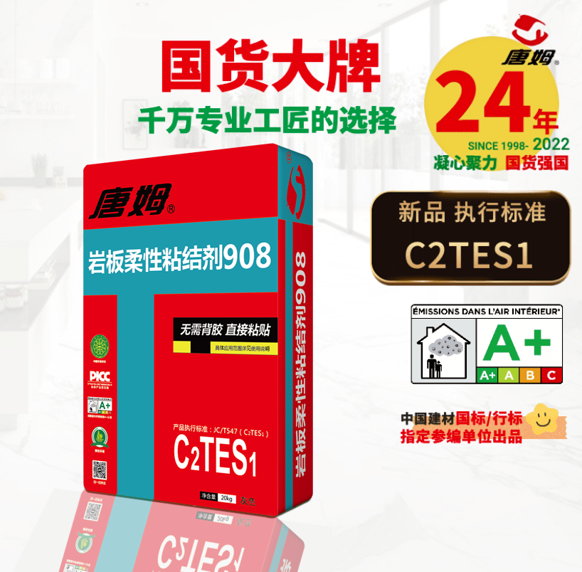 唐姆巖板柔性粘結(jié)劑908榮獲 “2022年度陶瓷行業(yè)綠色產(chǎn)品金獎 ”稱號,其是聚合物增強(qiáng)水泥基高強(qiáng)粉體粘結(jié)劑,加水?dāng)嚢杓纯墒褂。為粘貼巖板、薄板、大板、天然石材、人造石材等超大面材而研發(fā)的優(yōu)異膠粘劑產(chǎn)品。產(chǎn)品具有良好柔性、抗滑移動性、超強(qiáng)粘結(jié)性等特點。