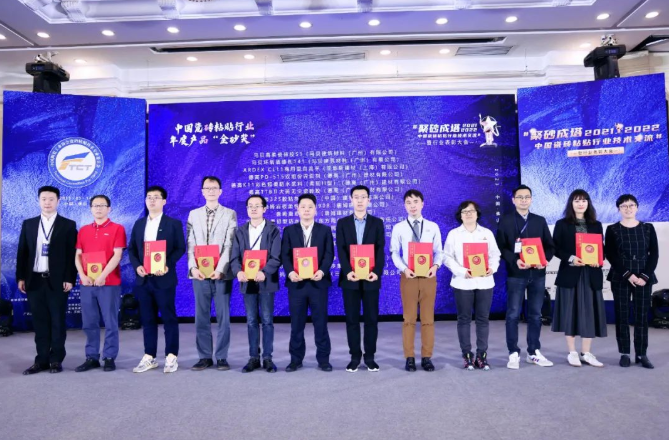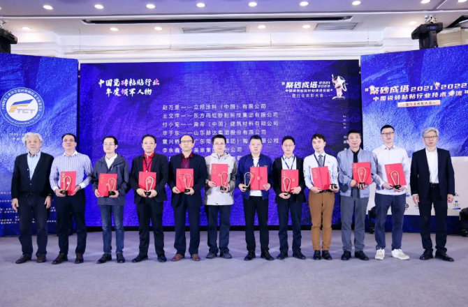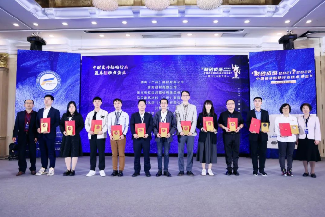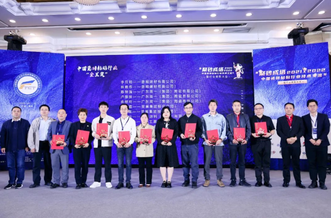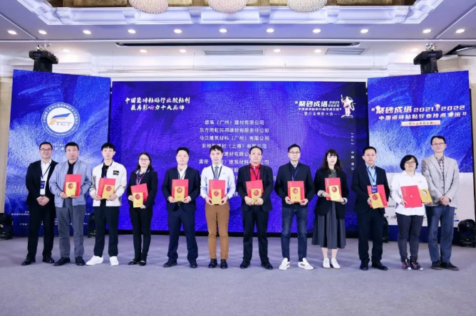 總經(jīng)理助理李月明先生(右三)和技術(shù)總監(jiān)林曉偉先生(右四)入選“2021-2022年度中國瓷磚粘貼行業(yè)金蘭獎”