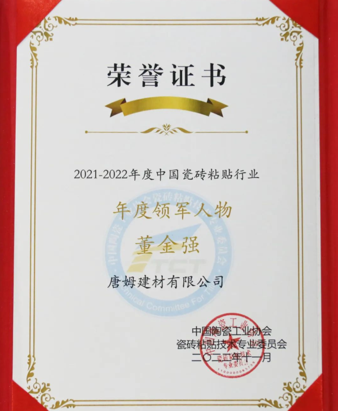 “中國·唐姆常務(wù)副總經(jīng)理董金強(qiáng)先生入選‘中國瓷磚粘貼行業(yè)年度領(lǐng)軍人物’”