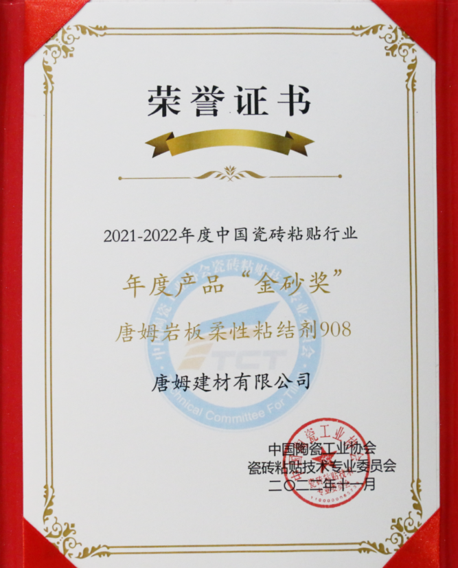 “中國瓷磚粘貼行業(yè)年度產(chǎn)品金砂獎——唐姆巖板柔性粘結(jié)劑908”