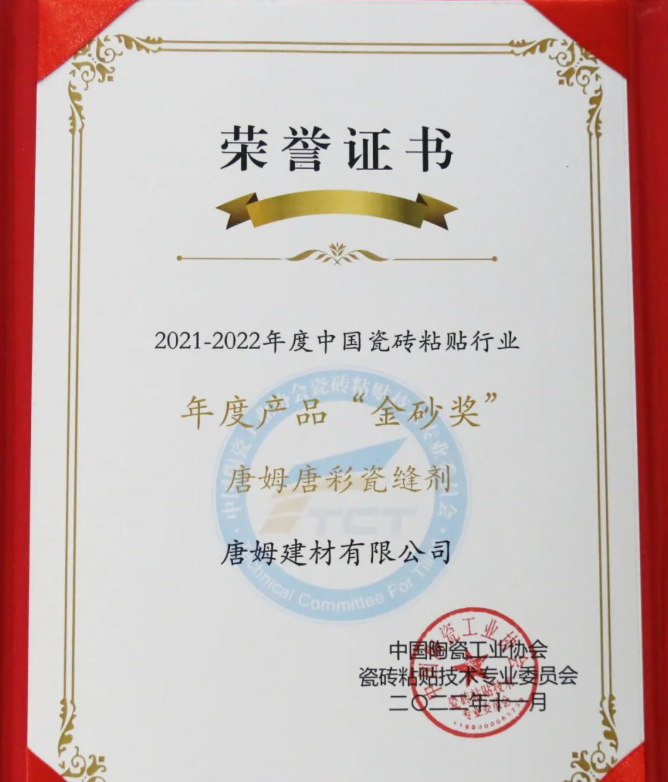 “中國瓷磚粘貼行業(yè)年度產(chǎn)品金砂獎——唐姆唐彩瓷縫劑”